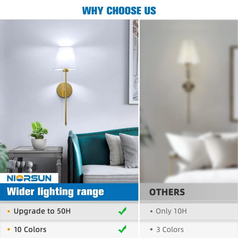 Wireless and easy to install: NIORSUN wall sconces set of two battery operated comes with two 300 lumen, 5200 mAh E26 rechargeable bulbs. It can work 25 hours at the highest brightness and 72 hours at low brightness when fully charged. Our rechargeable wall sconces redefine convenience with their easy installation—no wiring required. They are securely mounted with minimal effort; just drill two small holes for installation. With a sleek and contemporary design, these sconces blend effortlessly into any indoor space, providing both functionality and style.