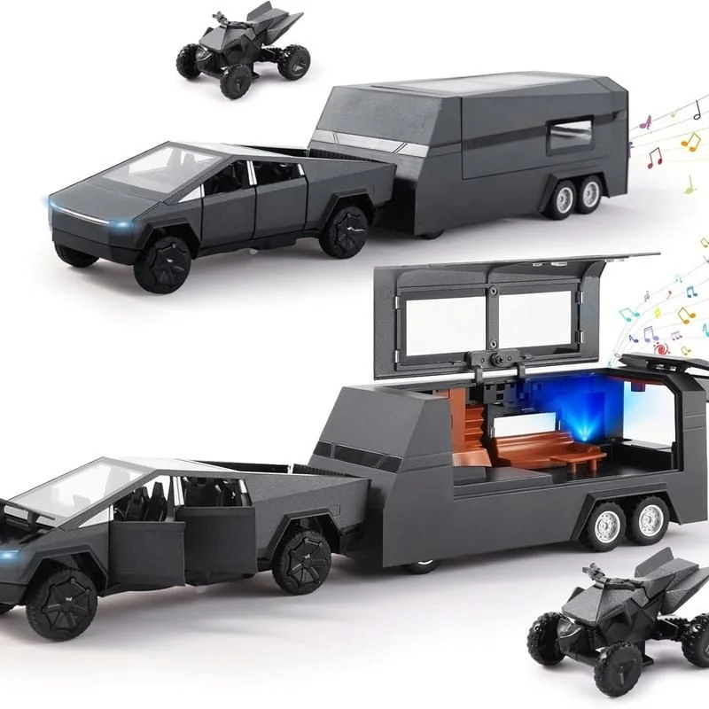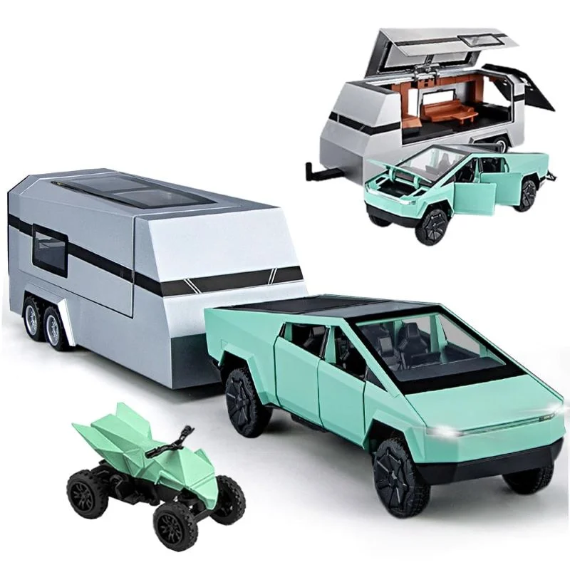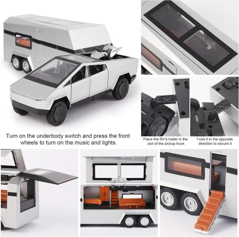 Premium alloy diecast pickup truck & trailer: This 1/32 scale truck and trailer set features a sturdy aluminum body with detailed ABS interiors and high-quality rubber tires. The pickup truck’s four doors, hood, and tailgate, along with the RV trailer’s side and rear doors, all open to reveal realistic interiors—perfect for boys and model car collectors.