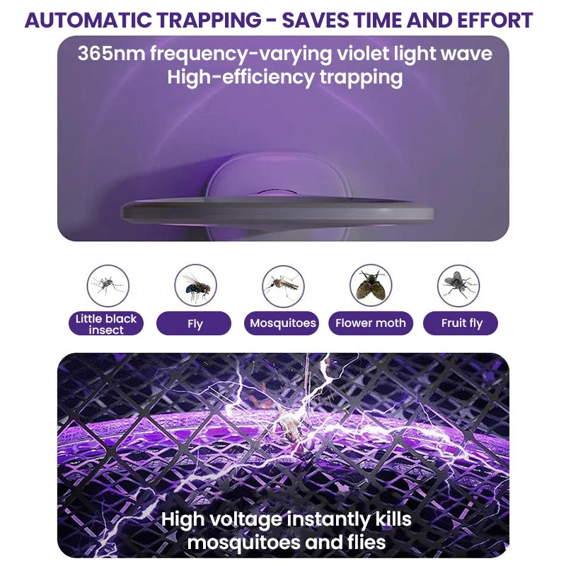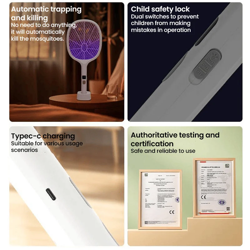 Electronic mosquito killer: Can be used at night, put the electric mosquito swatter on the base, connect the power supply, turn on the purple light. Mosquitoes will be attracted by the purple light and then got killed.