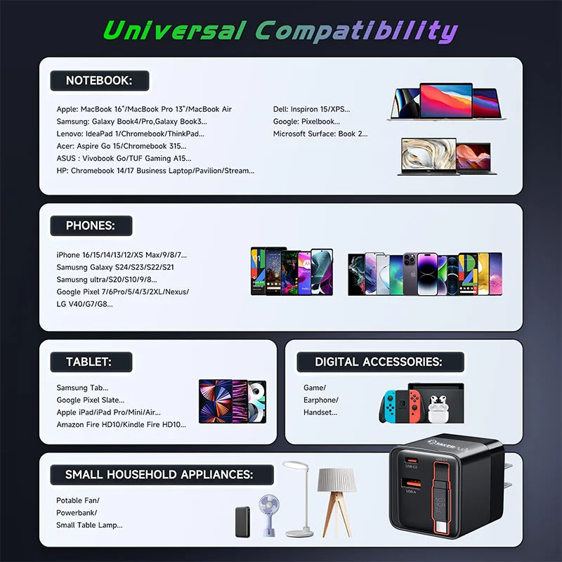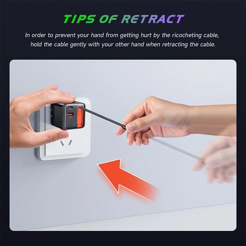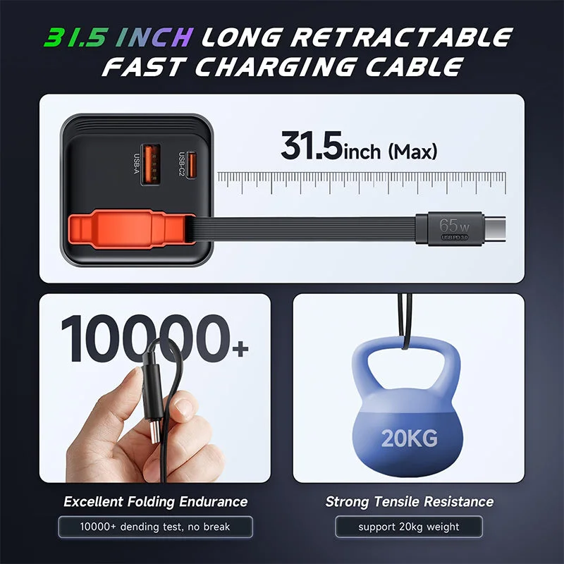 New Design USB-C Charger Block with Retractable Type-C Charging Cable: Comes with a convenient built-in 31.5-inch retractable fast charging cable, ensuring you always have the perfect length, and it retracts neatly for easy storage and portability.