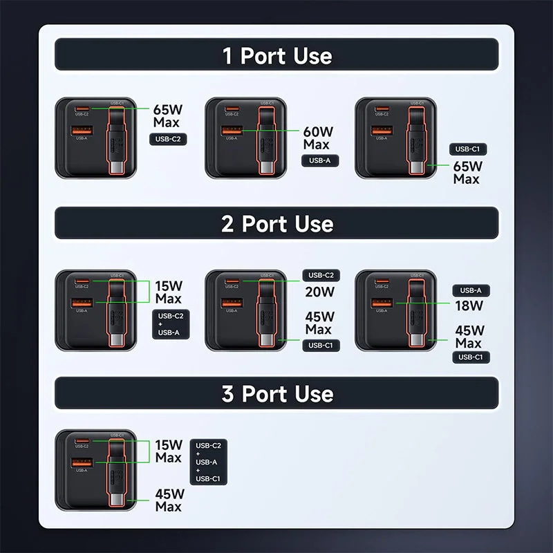 Powerful 65W GaN 3 Charging: This wall charger uses advanced GaN 3 technology to deliver up to 65W of power for ultra-fast and efficient charging of laptops, tablets, smartphones, and other electronic devices, ensuring rapid and efficient power delivery.