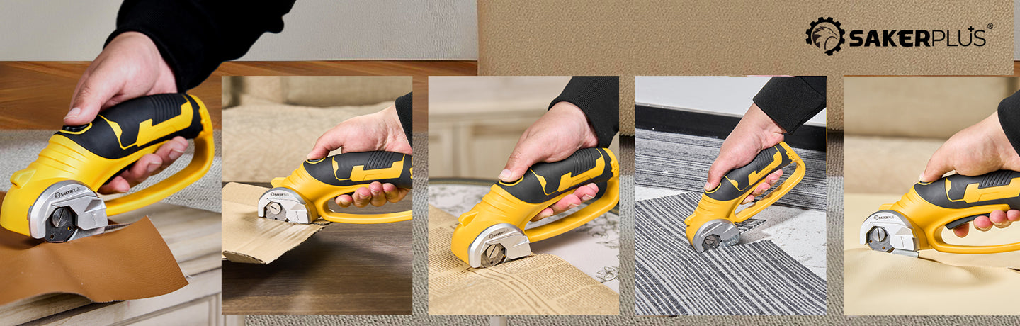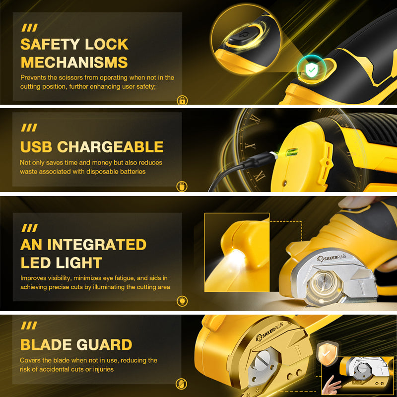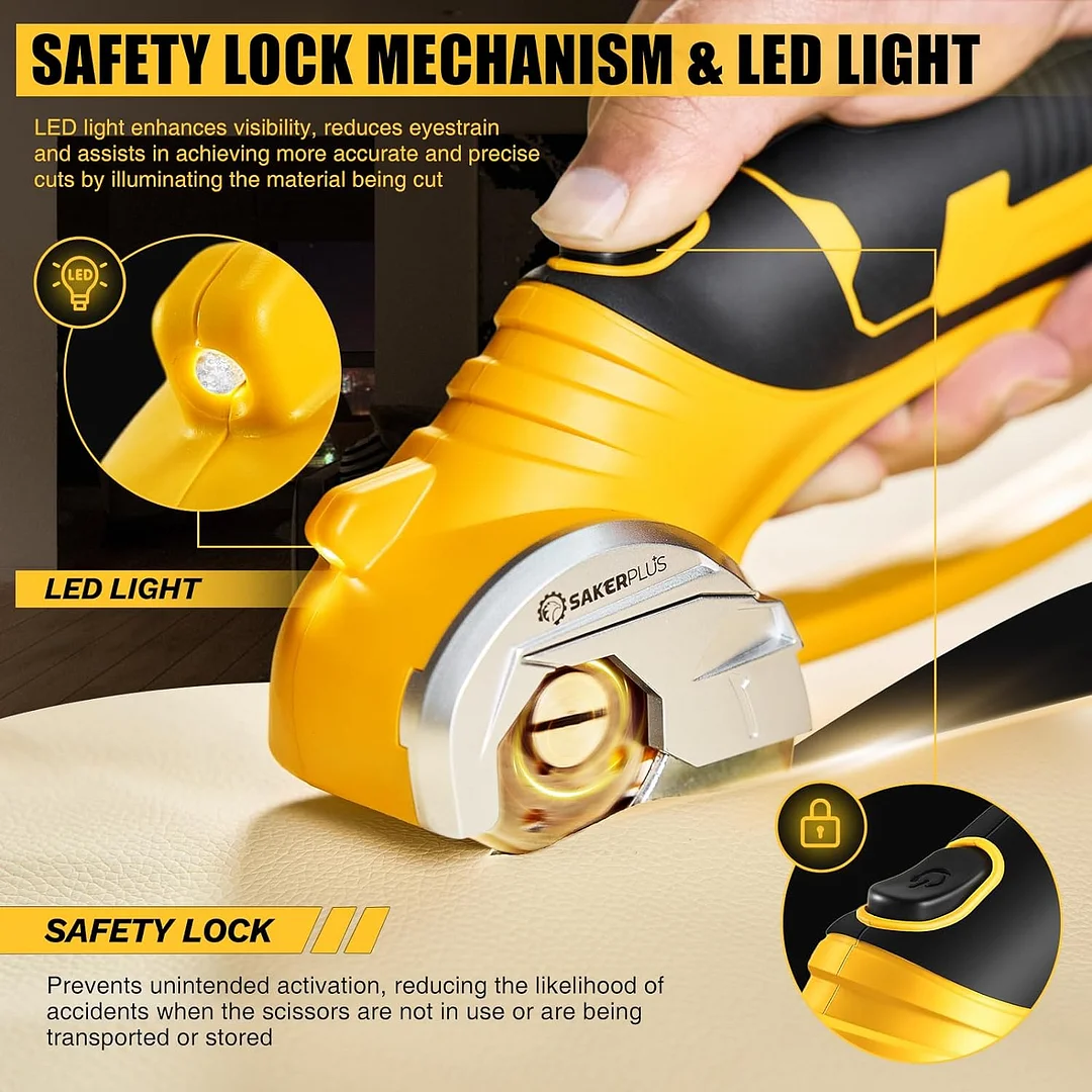 【SAFETY START & PROTECTION】SakerPluscordless electric scissors prioritize safety at every stage. Its safety start necessitates a deliberate press of the safety switch followed by triggering, ensuring secure and controlled usage every time. Encased within a metal shield, the blade leaves only a small cutting opening, guaranteeing a safe cutting experience without concerns of accidental cuts. Additionally, the front LED light enhances visibility in low-light environments. 【LIGHTWEIGHT & ERGONOMIC】Weighing merely 0.91 lbs, the SakerPlus electric box cutter offers outstanding portability without compromising power. Its lightweight build ensures prolonged use without inducing fatigue. Moreover, the ergonomic handle design, complete with non-slip soft grips, augments comfort and precision during operation.