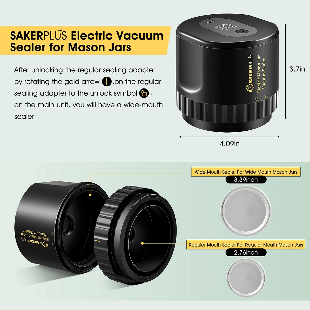 Suitable for Two Types of Mason Jars:SakerPlus electric mason jar vacuum sealer contains two sizes of mouth seals for your daily use.Switch between regular mouth and wide mouth mason jar applicators with an easy twist according to the user manual.