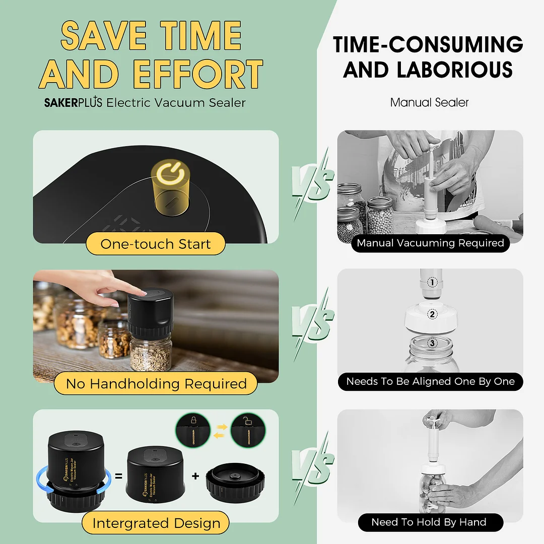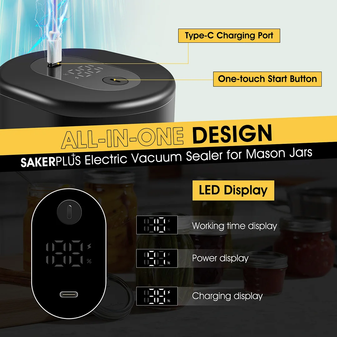 One-touch Start Button: SakerPlus electric vacuum sealer is meticulously designed for mason jars,experience the ultimate convenience of an easy one-touch start button, bidding farewell to any messy lids and welcoming a delightful extension of freshness.