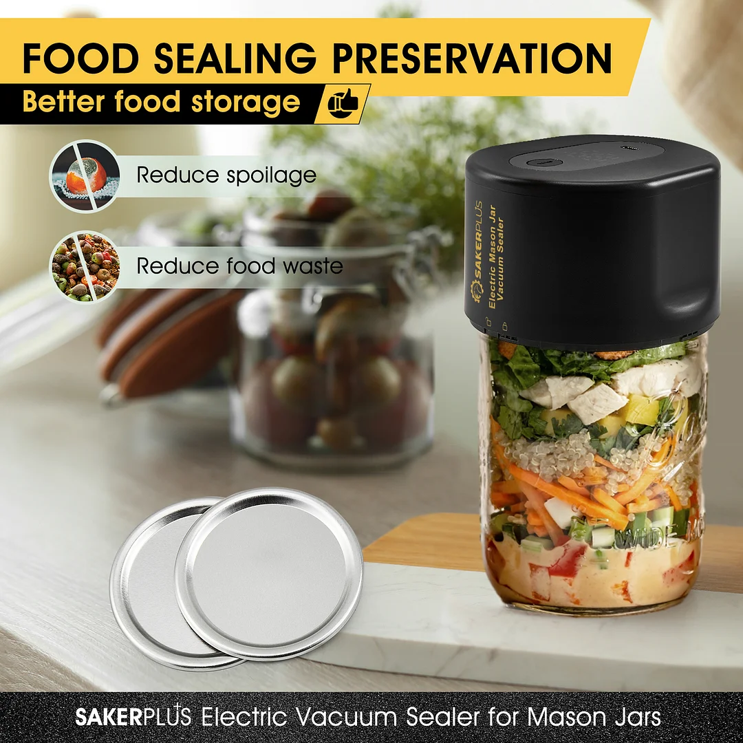 Mason Jar Sealer Vacuum Kit: SakerPlus comprehensive kit includes everything you need to get started – electric vacuum sealer,5* wide mouth mason jar lids,5* regular mouth mason jar lids, and instructions. Experience the convenience of SakerPlus electric vacuum sealer specifically designed for mason jars.