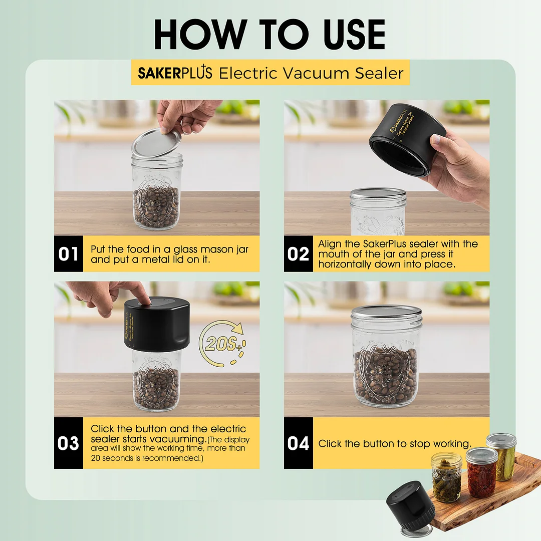 High-Capacity and Extended Usage Time: Equipped with a powerful battery, SakerPlus mason jar vacuum sealer offers extended usage time for sealing multiple mason jars in one go. Keep your favorite foods fresh for longer periods.The SakerPlus electric vacuum sealer ensures a strong suction force, effectively removing air from your mason jars and creating a secure seal to lock in flavors, nutrients, and freshness.