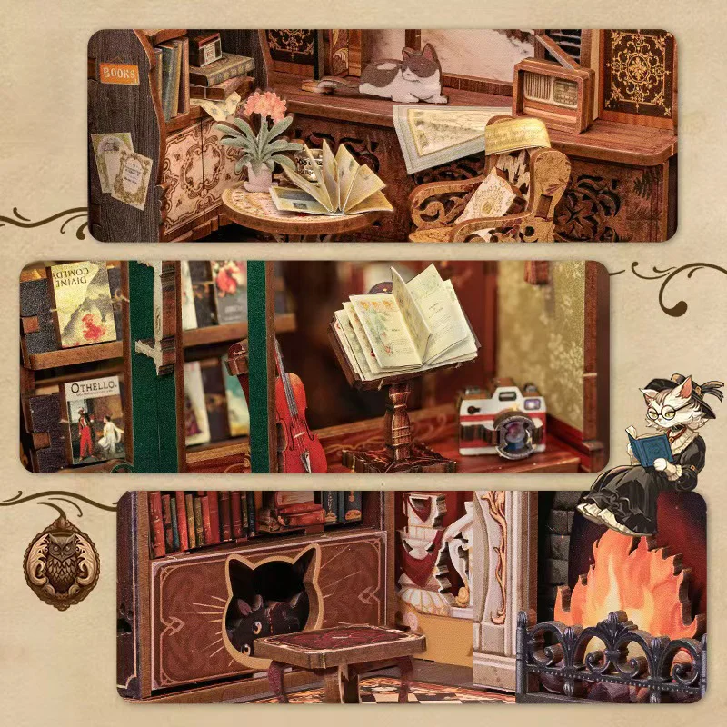 Book nook support customized or modified: The book nook is not assembled, you need to set it up by yourself and you can also customize your own book nook by adding your own mini things in place. The booknook comes with touch-sensored LED lights and a dust cover in the door to prevent dust.