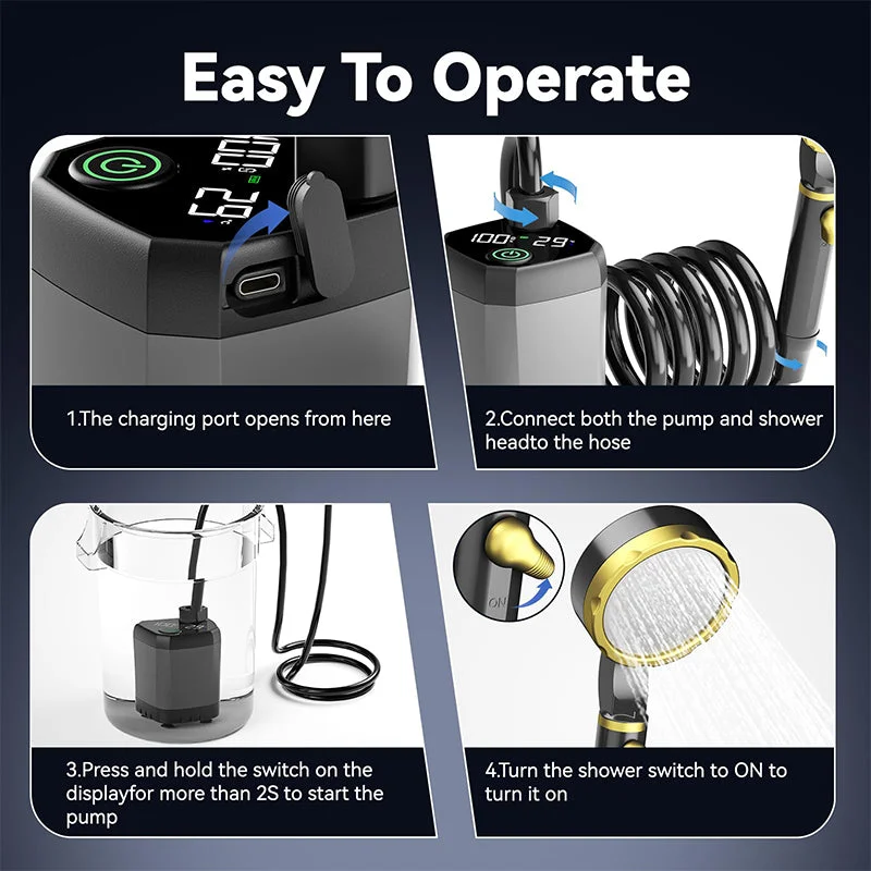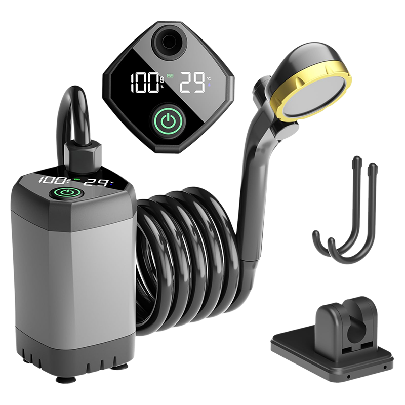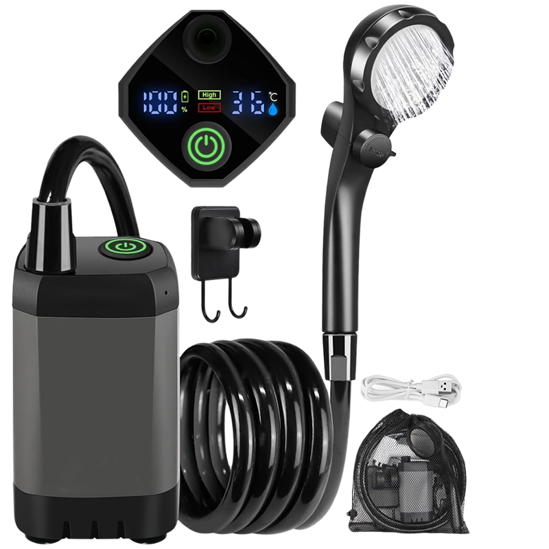 • Long battery life & Type-C charging: Equipped with a 6000mAh battery, this camping shower works continuously for 120–150 minutes. Easily rechargeable via phone charger, power bank, laptop, or car USB using the Type-C port with a waterproof silicone cover.