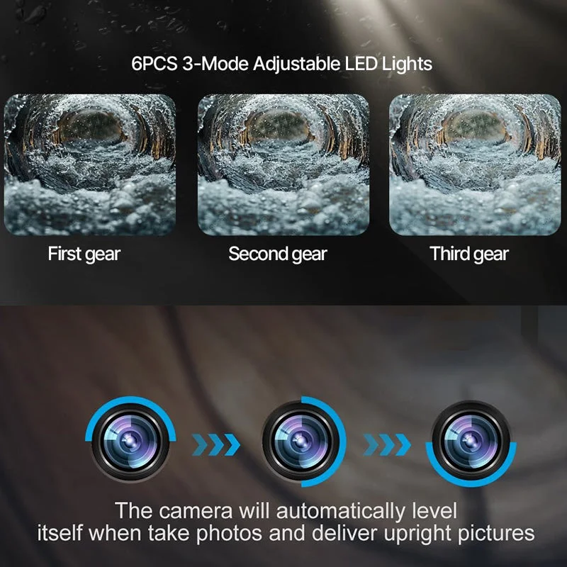 6PCS LED Lights & Self-Leveling Camera: Equipped with 6 adjustable LED lights offering three brightness modes, this sewer inspection camera provides clear visibility even in dark or challenging pipe conditions. Additionally, its self-leveling function ensures the camera automatically adjusts orientation, delivering upright images at all times for more accurate and reliable inspection results.