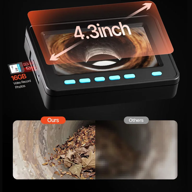 4.3-Inch HD Screen with 16GB Storage: This sewer inspection camera is equipped with a 4.3-inch high-definition display that delivers crystal-clear visuals, making it easy to identify even the smallest blockages. With a built-in 16GB memory card, it supports real-time video recording and photo capture, ensuring you never miss any critical detail.