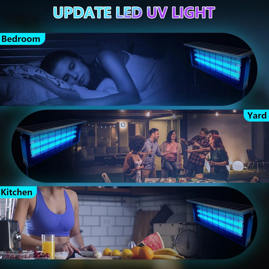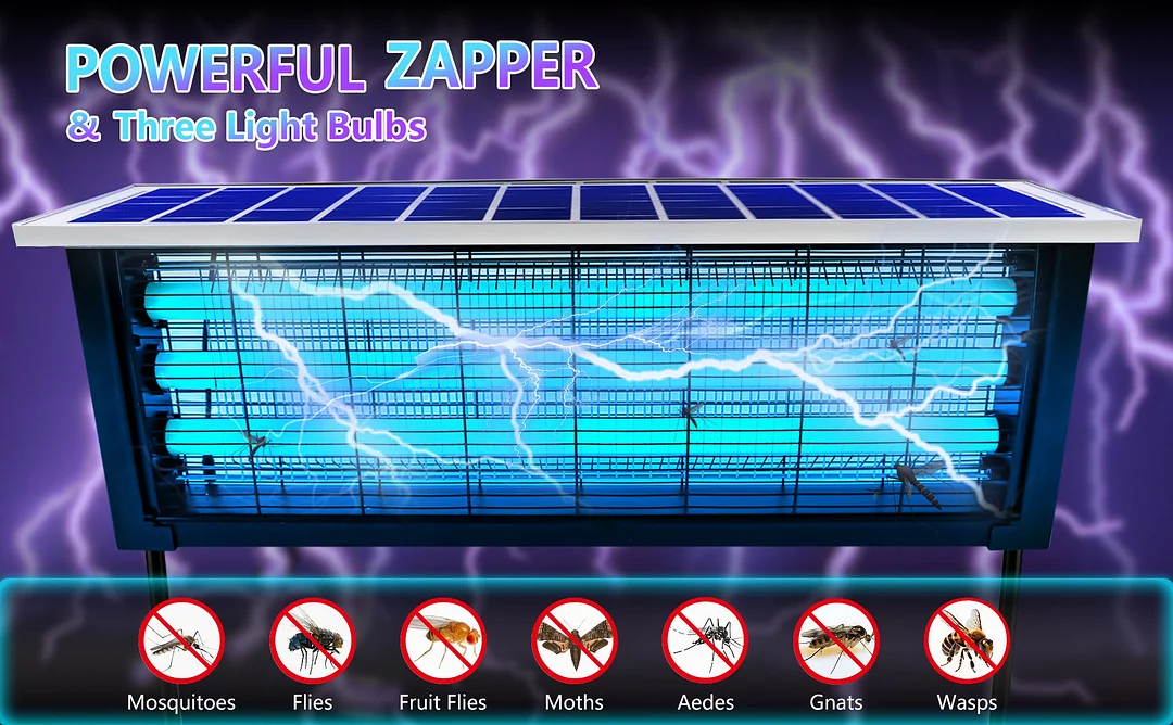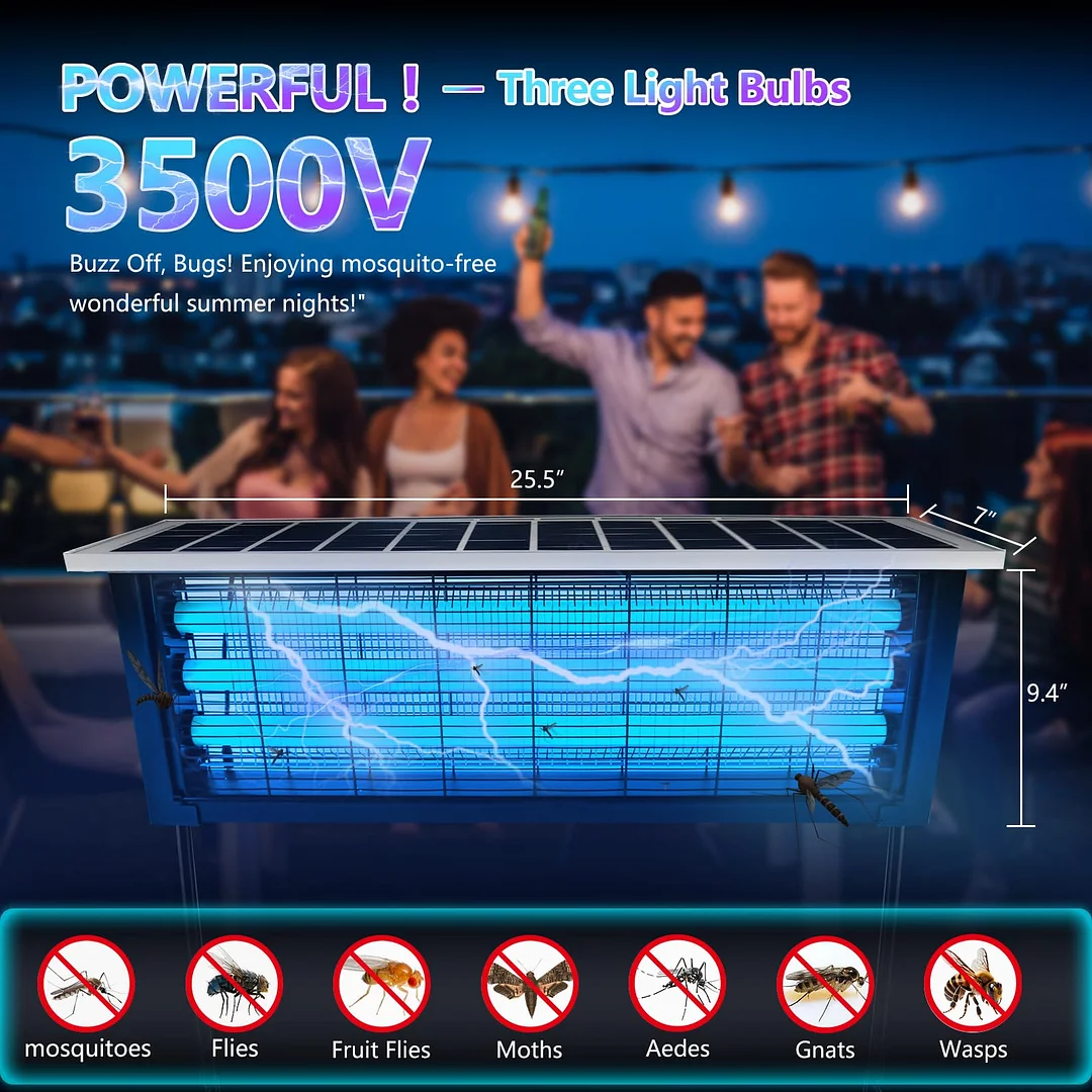 Powerful protection: Equipped with three high-intensity UV bulbs and a 3500V electric grid, this bug zapper delivers serious mosquito-fighting power. Say goodbye to buzzing pests and hello to mosquito-free summer nights. Whether you're relaxing in your garden, hosting a barbecue, or camping under the stars, this zapper keeps your space bug-free and peaceful.