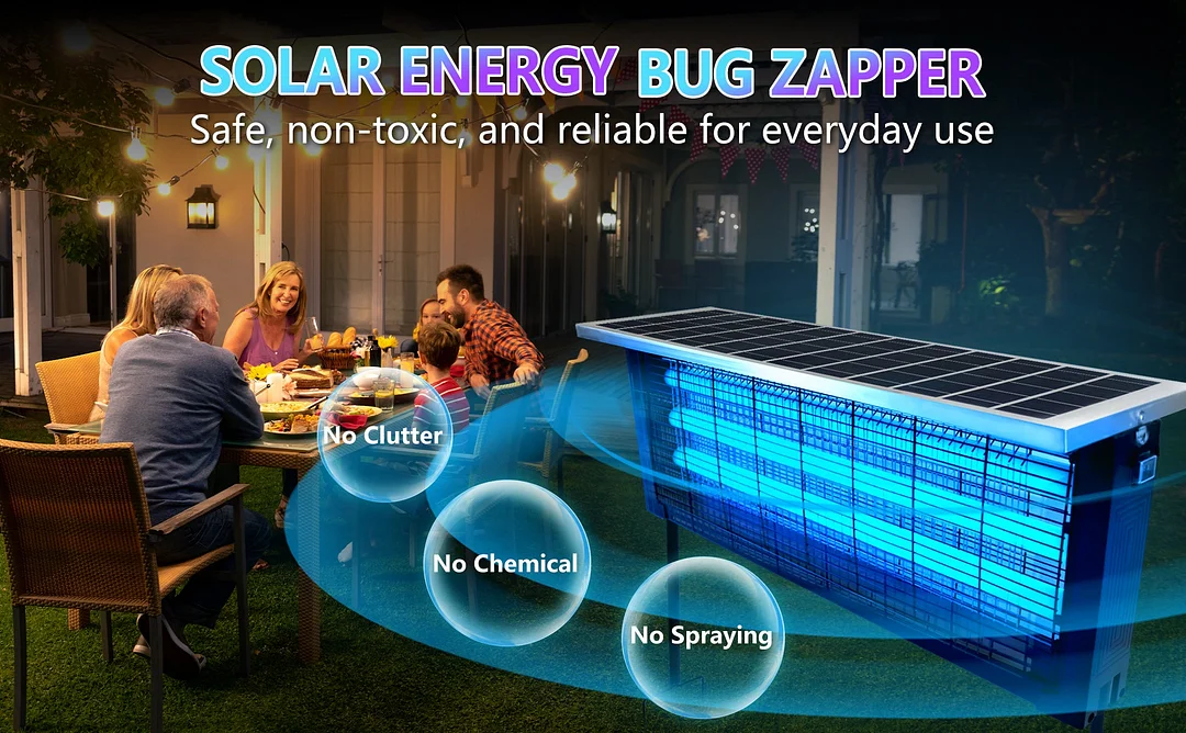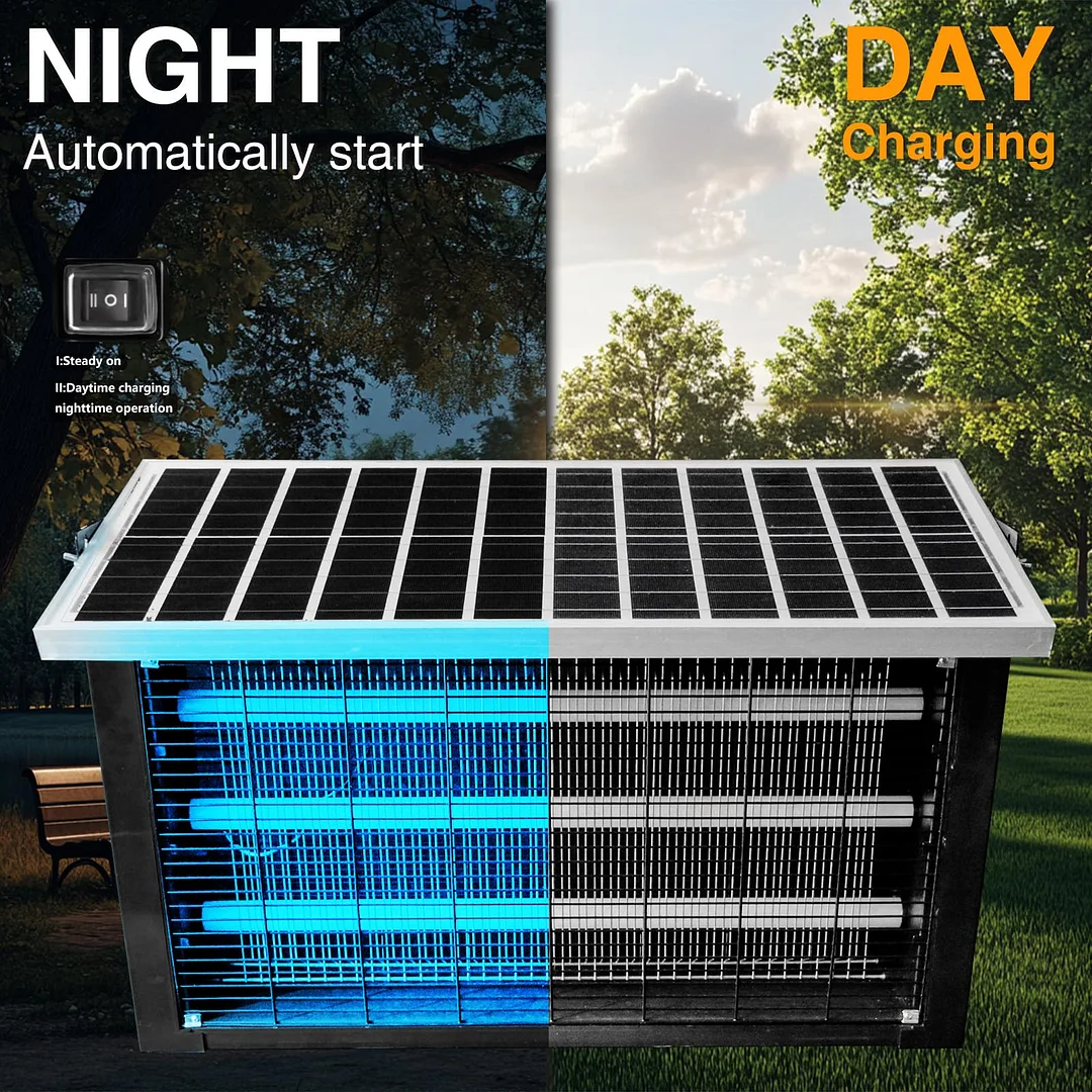 Two smart solar charging modes: This bug zapper offers two solar charging modes to meet different needs. In Auto Light-Sensitive Mode, it pauses mosquito elimination during the day while charging via solar power, then automatically activates at night. Prefer round-the-clock protection? Switch to Manual Always-On Mode for continuous mosquito elimination even while solar charging.