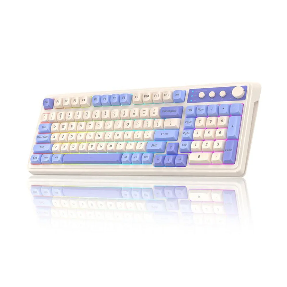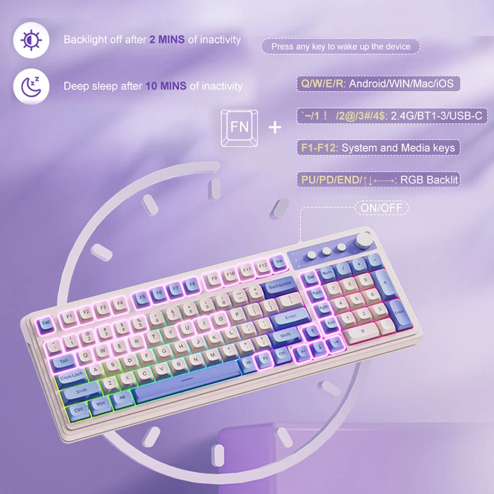 Custom keyboard: All keys on this wireless keyboard support macro customization, which allows you to record and edit macros to program a series of complex actions into a key, useful in very exciting real-time games. Bluetooth keyboard is equipped with dual-mode rotary knob for easy adjustment of volume, audio and lighting effects. Enjoy the fascination of technology and a new experience with the purple membrane keyboard.