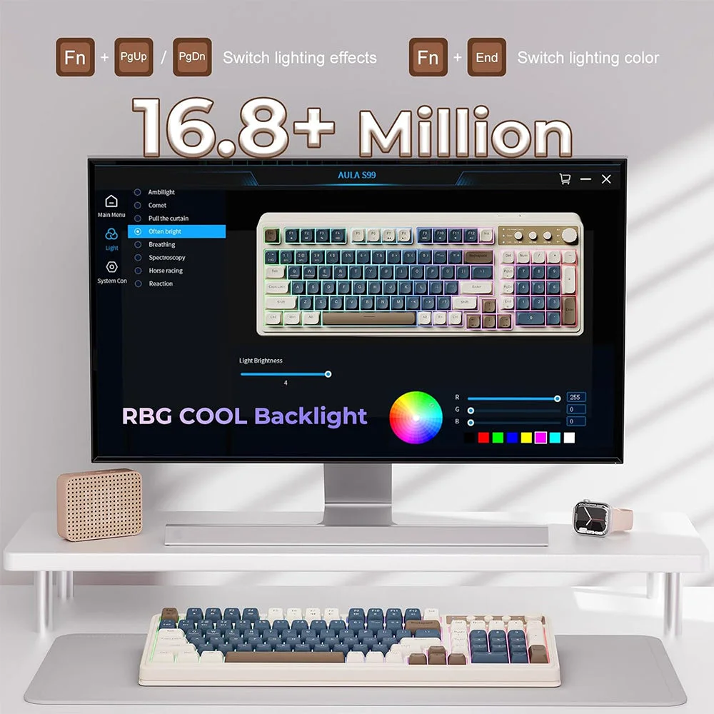 Cool RGB backlit keyboard: This LED keyboard features 16.8 million RGB light color, with 16 pre-set lighting effects to add a great atmosphere to the game. Lighting brightness and speed can be adjusted by the knob or the FN+key combination. With Macro soft, you can create unique lighting setup to make your rgb keyboard more interesting and create a personalized work or gaming environment.